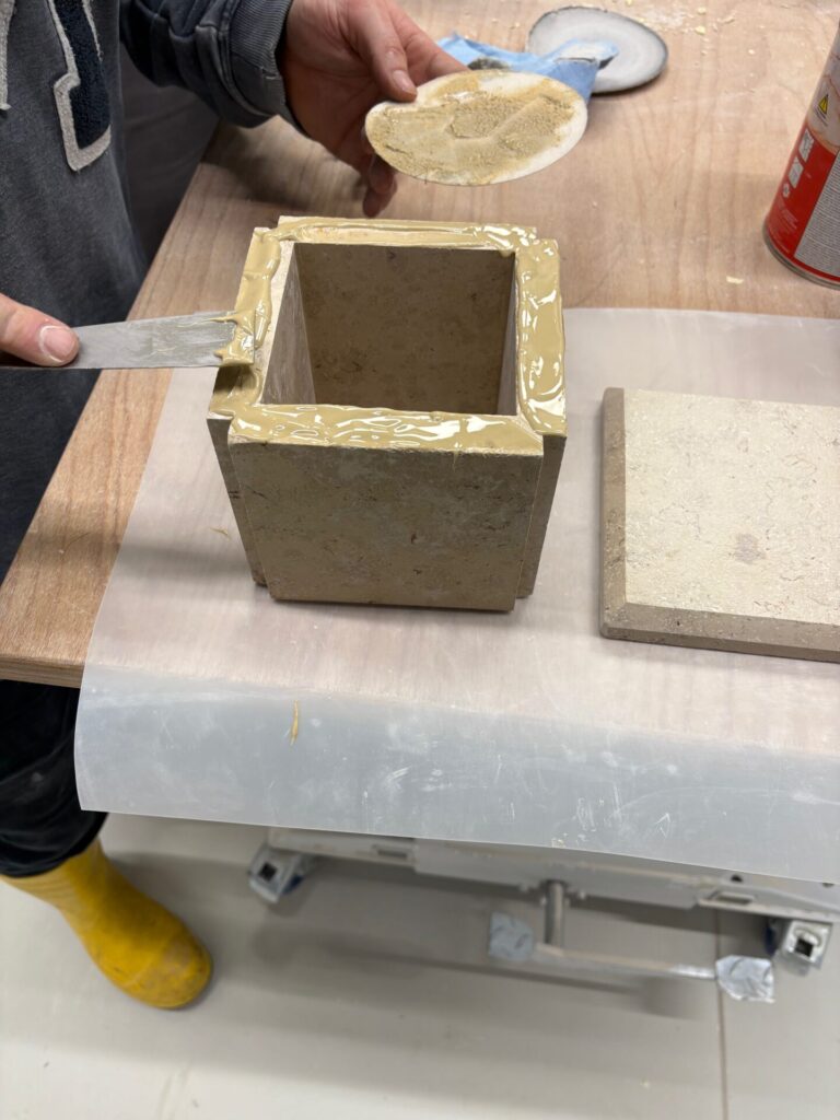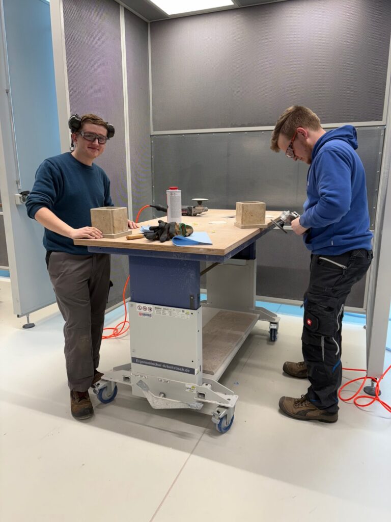 Ein kleines, feines Plattenobjekt, gedacht als Centerpiece bzw. Dekorationsobjekt für Couch- oder Esstische, das war Thema einer praktischen Unterrichtsübung. Die Schüler der Steinmetz- und Schleiftechnikklasse fertigten selbstständig und eigenverantwortlich die Objekte. Zunächst entstanden Planungszeichnungen in Palette CAD. Dann erfolgte der Zuschnitt der kleinen Plattenelemente an der Ablängsäge. Die schleiftechnische Bearbeitung erledigten die Schüler am Kantenautomat und von Hand. Sie achteten hierbei auf einen effizienten Arbeitsverlauf. Zum Abschluss erfolgte die klebetechnische Montage.