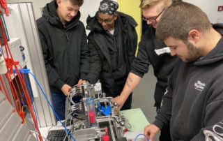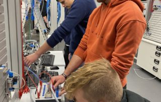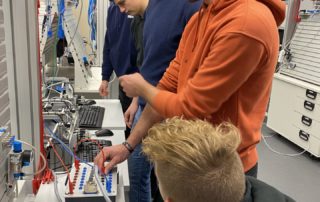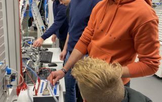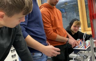 Im Fachunterricht der Naturwerksteinmechaniker programmieren die Schüler der Klasse NW 12 B ein Förderband, das metallische und nichtmetallische Körper automatisiert sortieren und transportieren kann. Dafür wird ein vollständiger Ablaufplan als Grundlage für die SPS-Steuerung am PC umgesetzt, welcher unmittelbar von den Schülern in Teams an den Anlagen in der Praxis ausgeführt und „erfahren“ wird.